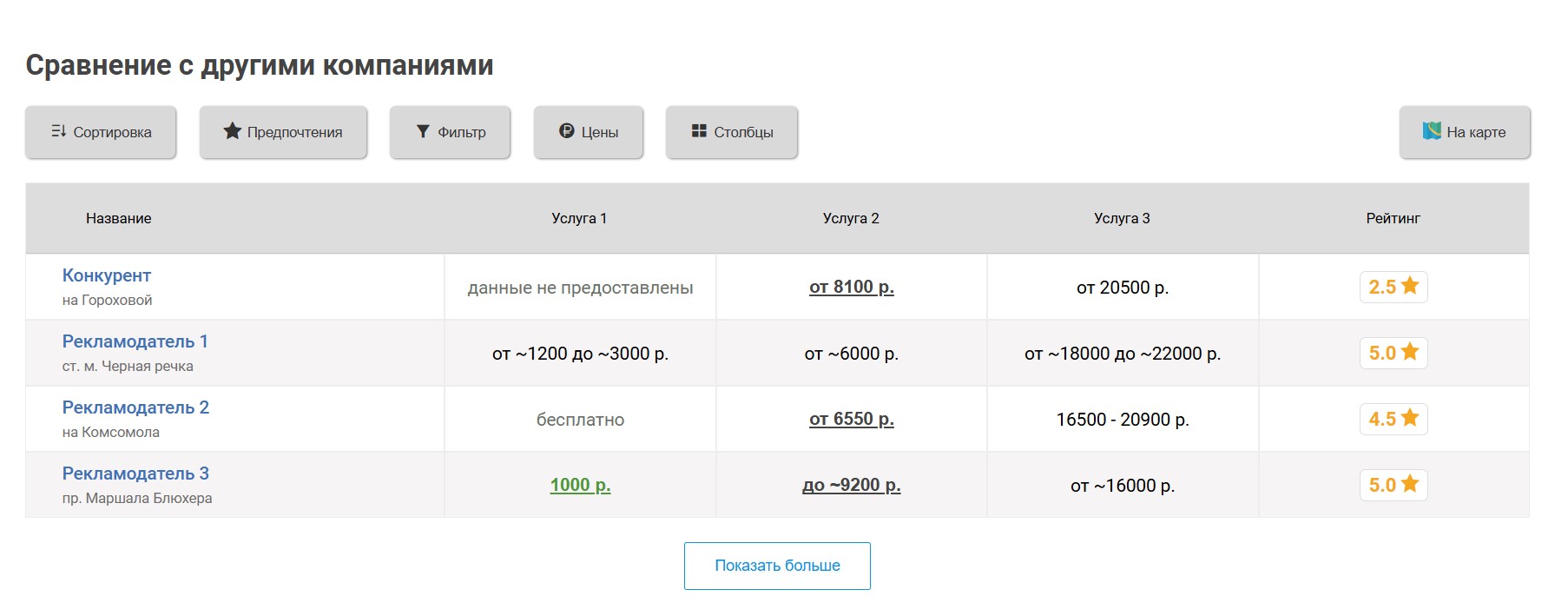 Если низкие цены — ваше конкурентное преимущество, их можно выделить. Размещение цен ниже определённого лимита является платным: чем ниже цена, тем дороже размещение. Стоимость и лимит зависят от конкретной услуги.